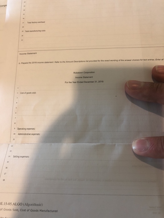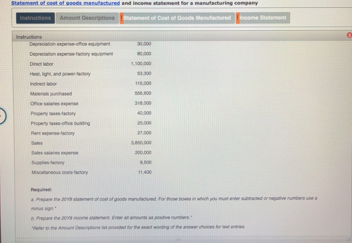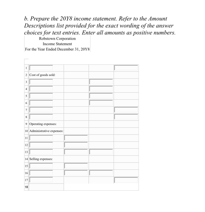 Use the list of labels and amount descriptions for the correct wording of text items other than account names. Robstown corporation income statement for the year ended december 31 20y8 sales 3 850 000 cost of goods sold. All income statements have a heading that display s the company name title of the statement and the time period of the report. Finished goods inventory january 1 20y8 101 200 cost of goods manufactured 1 989 250 cost of finished goods available for sale 2 090 450 finished goods inventory december 31.