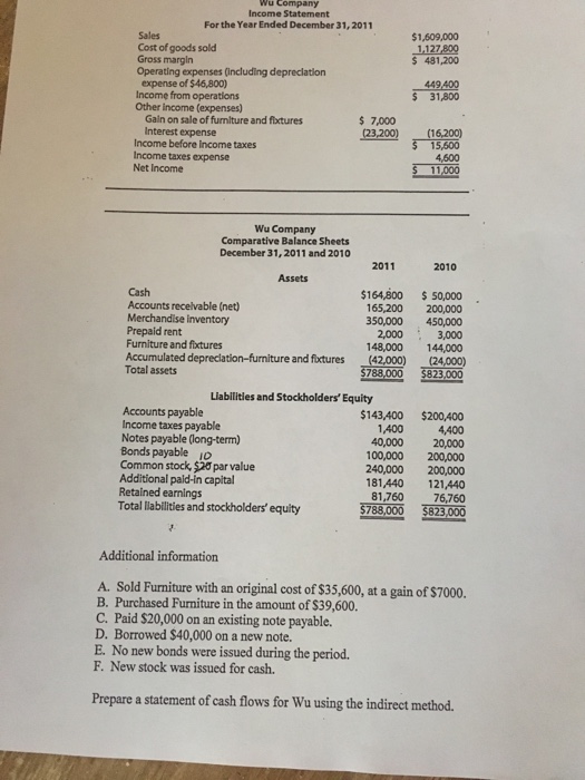 Sold at a gain of 7 000 furniture and fixtures that cost 35 600 on which it had accumulated depreciation of 28 800. Wu company s income statement for the year ended december 31 2011 and its comparative balance sheets as of december 31 2011 and 2010 are presented on the next page. Answer to wu company s income statement for the year ended december 31 2011 and its comparative balance sheets as of december. During 2011 wu company engaged in these transactions.